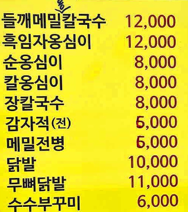 - 특징: 강원권 전통 매콤/구수 스타일 칼국수
