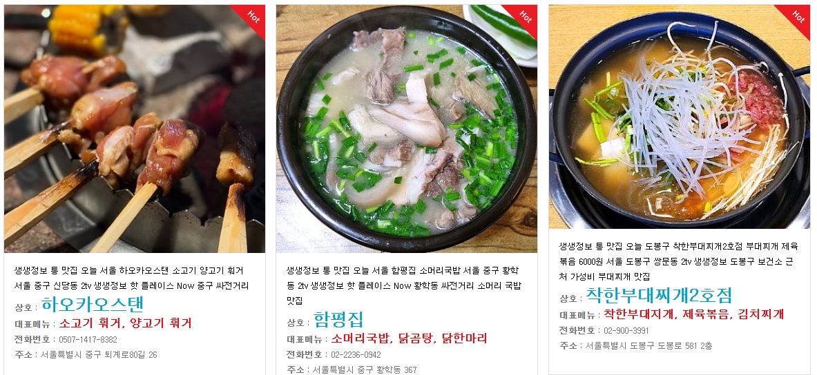 - 방송 맛집 정보(업소명·위치·전화번호·대표메뉴·영업시간 등) 모두 제공